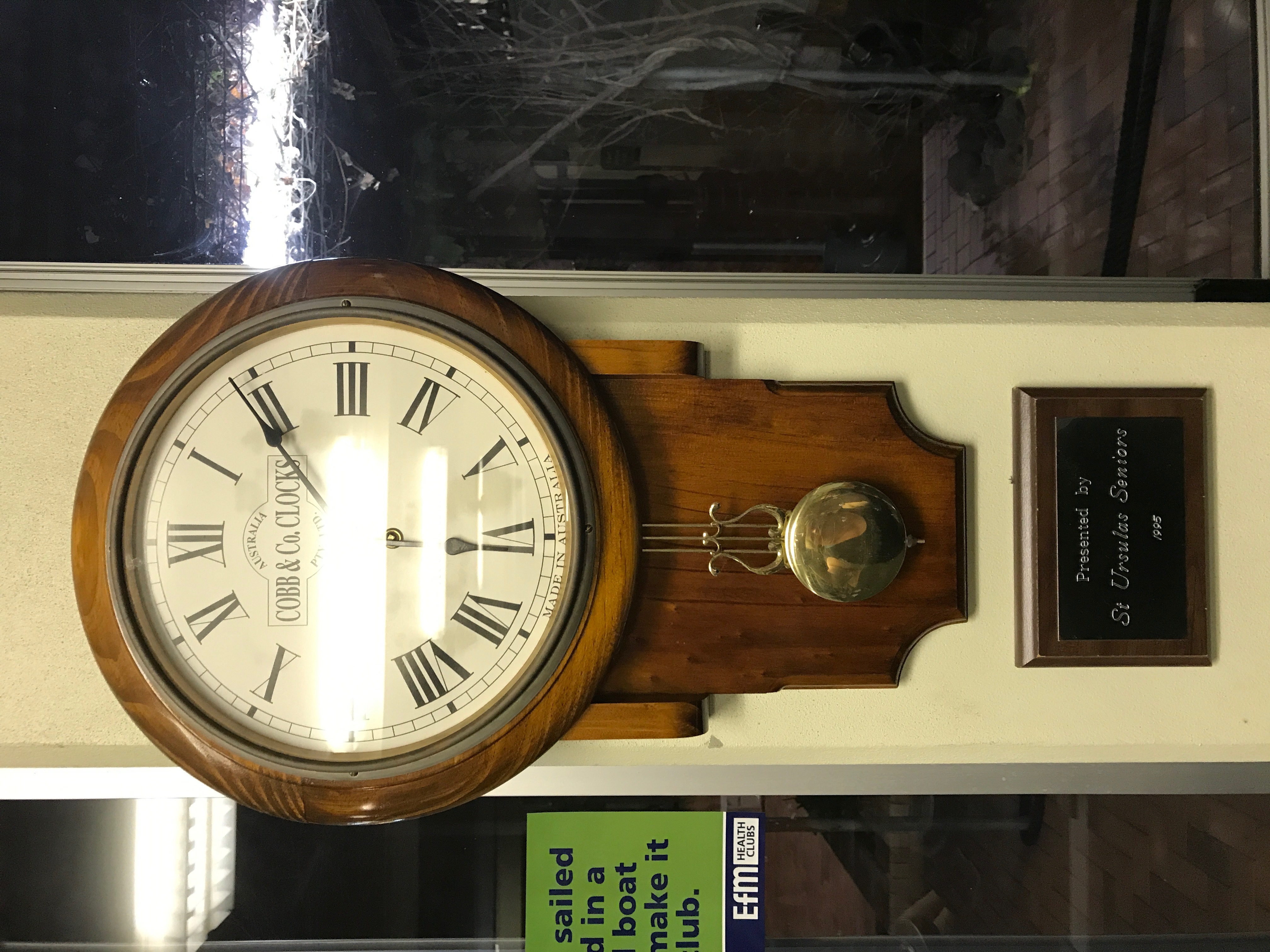 & Co. pendulum chime clock on northern wall of Gym |