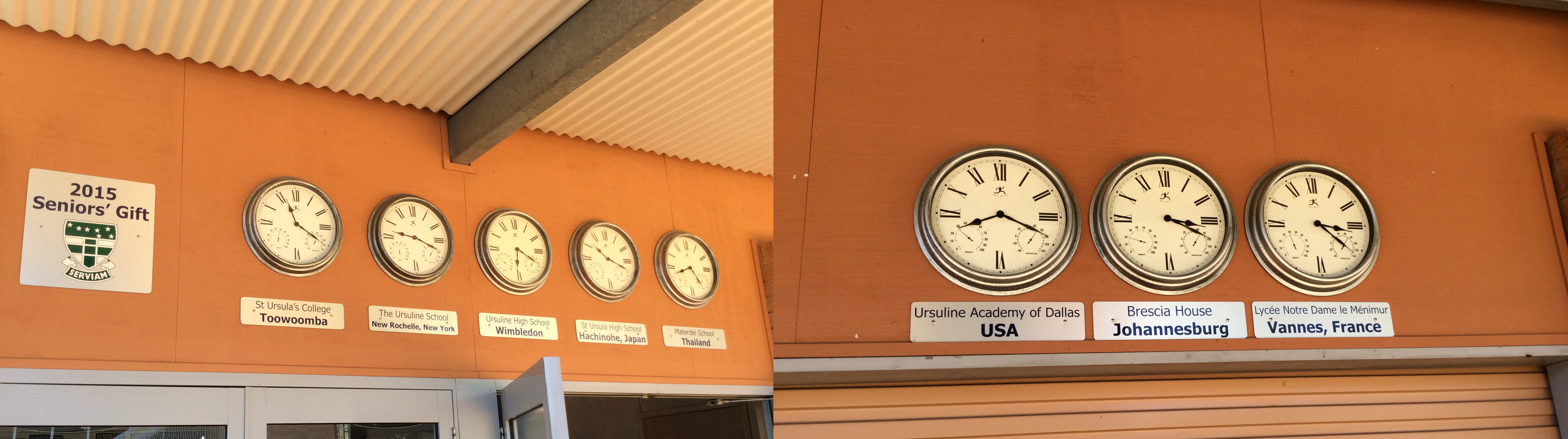 clocks showing time of Ursuline communities worldwide above Salo courtyard